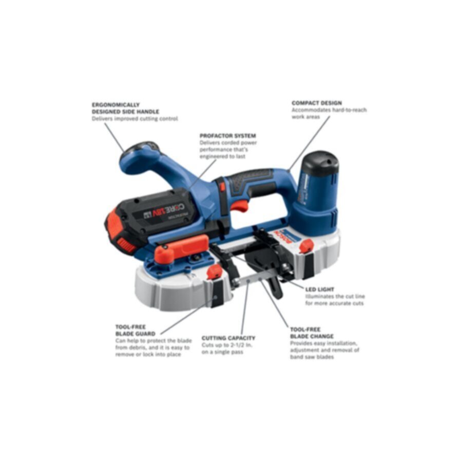 The Bosch GCB18V-2N 18V Compact Band Saw is designed to make pro cuts in tight spaces, corners and overhead, weighing only 7.3 Lbs. (tool only, not including battery). The saw is up to 60% lighter and 40% more compact than standard deep-cut band saws. It has a cut-rate of 530 surface feet per minute. It accommodates most common-size materials, with cuts up to 2-1/2 In. on a single pass, delivering precise cuts to a variety of metal materials – including conduit, uni-strut, threaded rod, and copper and black pipe.