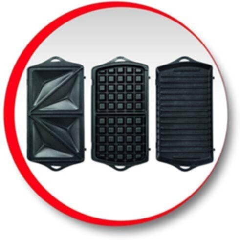 | Type of plates | Triangular Sandwich Multifunction Waffles and Sandwich Maker : 3 sets of interchangeable plates for quick and easy meals any time of the day MULTIFUNCTION: WAFFLE, TRIANGULAR TOASTED SANDWICH AND GRILL / PANINI Multifunction: 3 sets of interchangeable plates for quick and easy meals any time of the day EASY TO CLEAN Dishwasher safe removable plates EASY TO STORE Vertical storage. EASY TO USE Indicator light on/off and end of preheating. REMOVABLE PLATES NON STICK COATING Easy to clean Dishwasher safe VERTICAL STORAGE Easy to store PILOT LIGHTS ON/OFF AND END OF PREHEATING Easy to use Break Time, the ideal appliance for your sweet or savory cravings! Start using Break Time now! An appliance with a variety of uses for any time of the day, for easy meals that are quick to prepare! Thanks to its interchangeable sets, you can now use this sandwich maker to toast sandwiches, heat up Panini and also prepare delicious waffles. Break Time is particularly easy to clean thanks to its non stick plates for daily use. Its vertical design allows you to store the sandwich maker easily and the ruby red color adds a modern touch to your kitchen. • Panini, Sandwich and Waffle maker • 700W • 3 Removable Non Stick Coated Plates