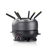 Put the fondue set on your table to enjoy some quality time over dinner together. This highly versatile cooker is equipped with an adjustable thermostat and a removable fork ring to vary endlessly with Swiss cheese fondue, chocolate fondue, Chinese hotpot or a traditional oil fondue. The pot is also great for keeping soups or stews warm. The non stick fondue pot contains up to 2.3 litres, is very easy to clean and comes with 6 forks.
