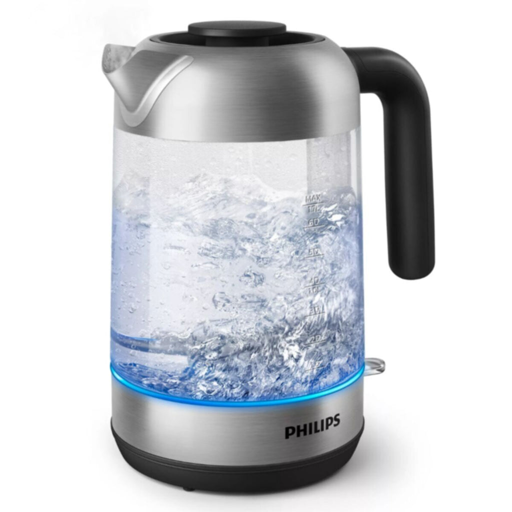 Our family size 1.7L glass kettle features a modern design with intuitive blue light indicator inside the base to inform you when the kettle is on.