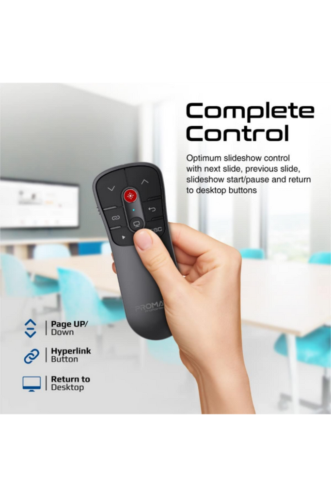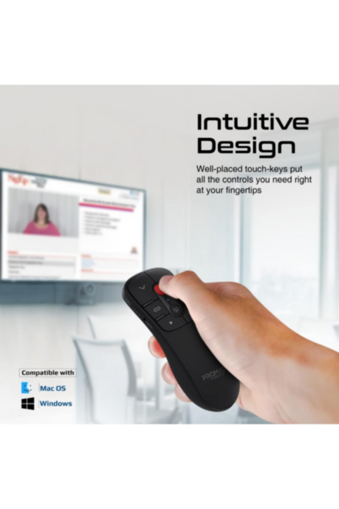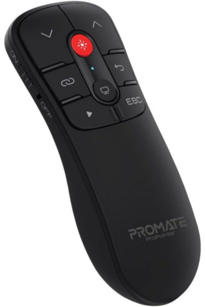 ProPointer is a universal, intuitive, wireless laser pointer and remote control presenter. This presenter is wireless, which means you can walk as you talk without getting wrapped up in power cords. The built in laser pointer lets you highlight important information from the back of the conference room. The light, small, and compact design is convenient for travel. It clicks smoothly through PowerPoint slides.
