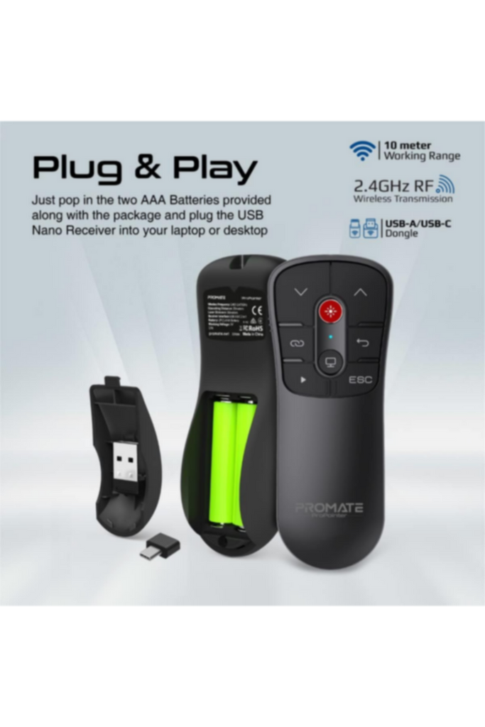 The ProPointer has a powerful Red Laser Light which starts and stops at the command of the user. The Red Laser is powerful enough to a distance of 50 meters. The Laser pointer helps in pointing out important features and topics in your presentation with accurate precision.