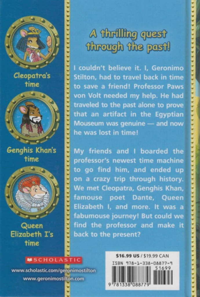 A thrilling quest through the past! I couldn't believe it. I, Geronimo Stilton, had to travel back in time to save a friend! Professor Paws von Volt needed my help. He had traveled to the past alone to prove that an artifact in the Egyptian Mouseum was genuine - and now he was lost in time!My friends and I boarded the professor's newest time machine to go find him, and ended up on a crazy trip through history. We met Cleopatra, Genghis Khan, famouse poet Dante, Queen Elizabeth I, and more. It was a fabumouse journey! But could we find the professor and make it back to the present?