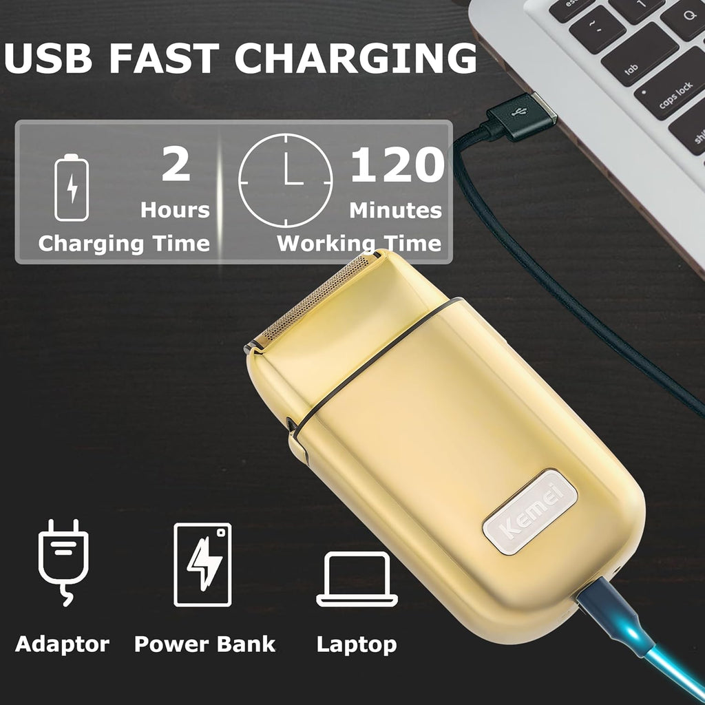 The Kemei KM‑TX1 is a premium, full-metal foil shaver designed for dry and wet shaving. With a robust zinc-alloy body, twin floating foil heads, and USB-C fast charging, it delivers up to 120 minutes of runtime—perfect for smooth, close shaves at home or on the go.