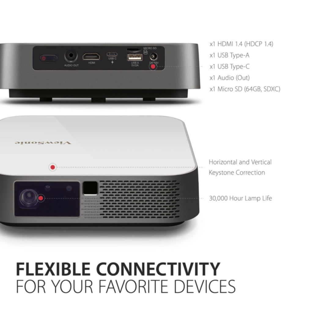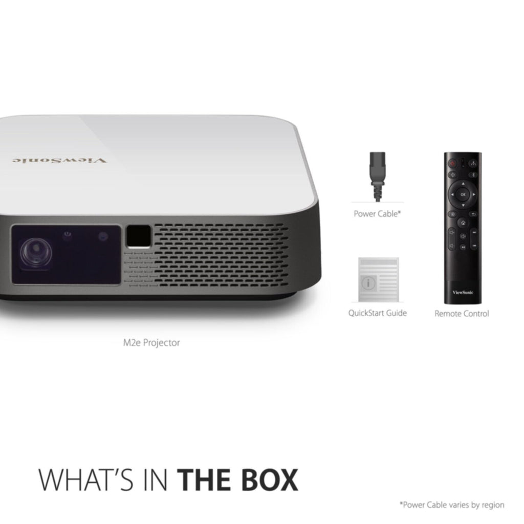 The M2e is a 1080p Full HD smart portable LED projector that delivers instant fun at the push of a button. Setup is effortless with instant auto focus and advanced auto keystone capabilities, and its ultralight portable design allows you to take the cinema experience wherever you go. Experience crystal clear visuals in Full HD resolution and cinematic colors covering 125% Rec.709 supported by ViewSonic" s industry leading 2nd generation LED technology. The M2e combines pixel perfect images with exceptional sound quality through integrated dual speakers customized by Harman Kardon. Add even more fun with smart connectivity features such as Wi Fi for wireless screen mirroring to get your phone up on the big screen, Bluetooth for alternative audio options, and USB Type C for direct single cable streaming from Nintendo Switch.